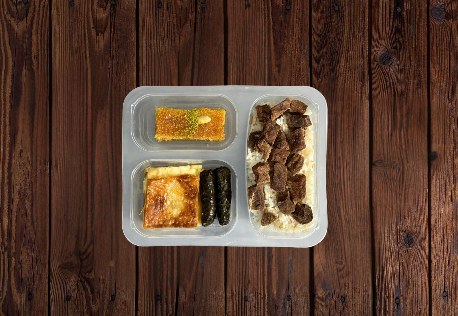 Toplu yemek organizasyonlarında en çok tercih edilen kombinasyonlardan biri olan pilav üstü et kavurma, zeytinyağlı yaprak sarma ve irmik tatlısı; ana yemek, ara lezzet ve tatlı dengesini mükemmel şekilde sağlar.